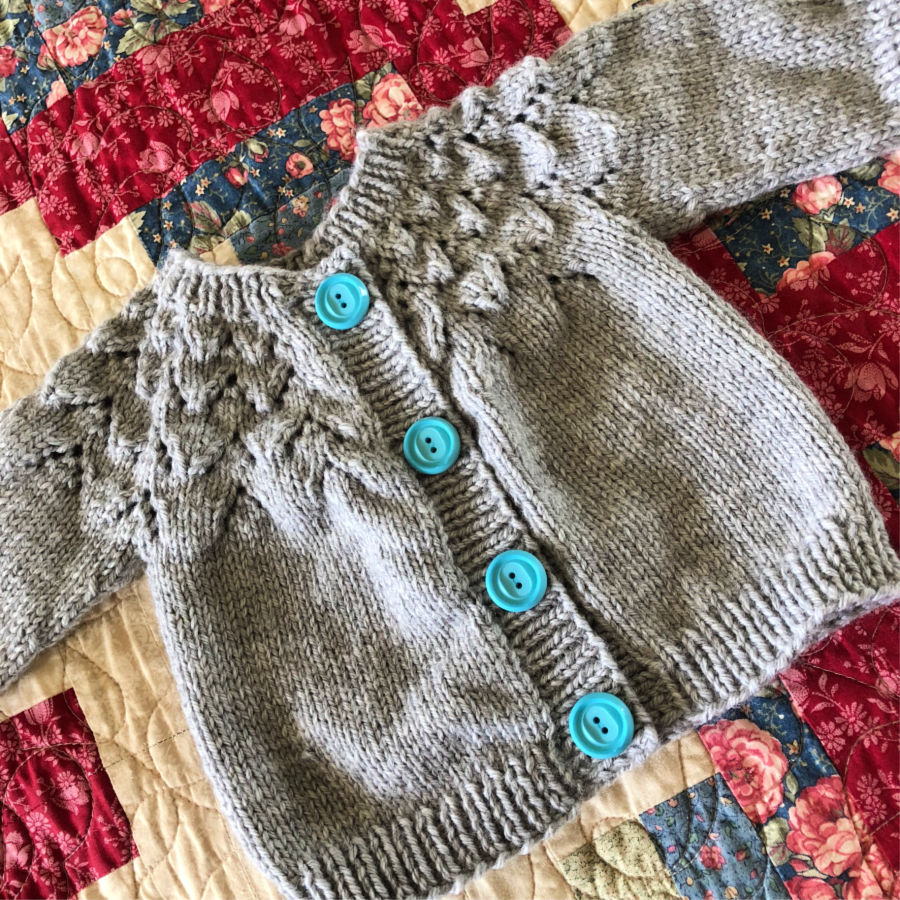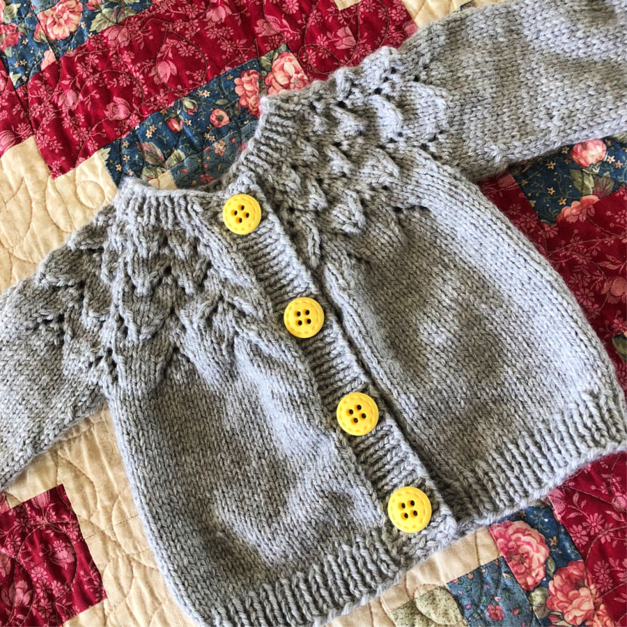 I made this in May for a “mystery baby” – a baby whose gender is a secret or surprise until birth. I don’t think babies care what colour they are dressed in, but adults do so I was careful to stick to gender-neutral shades. The baby has since arrived and little Con is reported to be very happily wearing his cardigan.